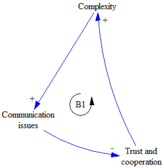 The loop (B1), as evident from Figure 8, indicates that ‘Communication issues’ lead to a corresponding decrease in trust and cooperation throughout CSCs. Further, a decrease in trust and cooperation leads to increased complexity in projects, which eventually leads to a corresponding increase in communication issues.