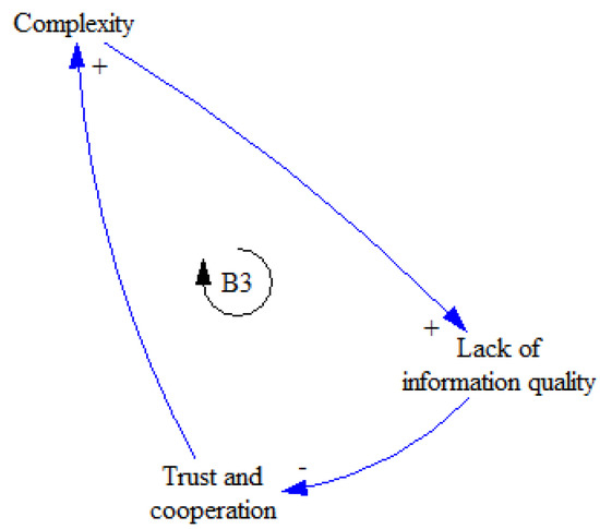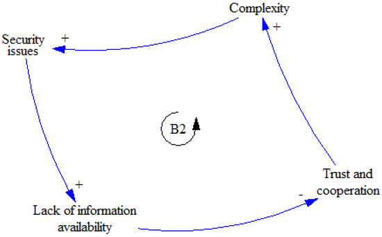 The loop (B2), as evident from Figure 9, indicates that ‘Lack of information availability’ decreases trust and cooperation and increases complexity in projects. This leads to a corresponding increase in security issues and a lack of information availability. Hence, the availability of information is necessary to resolve all issues in CSCs.