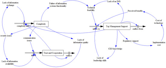- The boundary adequacy test is used to verify whether the essential concepts and structures addressing the problem are endogenous to the model or not [62]. The model must include all important variables that affect the system’s behavior. The exogenous variables in this study include complexity, top management support, and trust and cooperation. The endogenous variables include failure of information systems functionality, lack of information exchange, communication issues, lack of an IM system, lack of information availability, lack of information quality, implementation cost, and lack of leadership skills. After examining the SD model, it is found that all the variables are relevant and in line with the published literature.