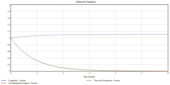 The decrease and increase in the curve of the simulation graphs are explained subsequently. The simulation presents a behavior-over-time graph. Figure 13 shows a simulation graph of all three variables assessed in this study. There is an abrupt decrease in two variables, trust and cooperation and top management support, when these are simulated against project complexity. Therefore, it can be deduced that with increasing project complexity, the support from top management and the level of trust and cooperation among project stakeholders go down. Alternatively, by controlling project complexity, management support will increase trust and cooperation among project stakeholders.