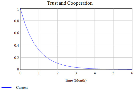 The ‘Trust and Cooperation’ graph shows a draining process that implies that factors in the loop play a negative role, as evident from Figure 15. ‘Trust and Cooperation’ is at a maximum at first, but with time, it decreases rapidly. This decrease is rapid in the initial days and slows down with time. The inflow of ‘Trust and Cooperation’, consisting of lack of information quality, lack of information availability, and communication issues, decreases the trust and cooperation among project stakeholders in the CSC system. In order to increase ‘Trust and Cooperation’, the impact of these variables must be addressed in the CSC.