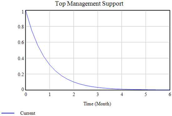 The graph of ‘Top Management Support’ also shows a draining process that implies that factors in the loop play a negative role, as evident from Figure 16. It is at a maximum at first, but it decreases rapidly in the initial days and then slows down with time. The inflow of ‘Top Management Support’, consisting of lack of leadership skills, perceived benefits, and technical feasibility, decreases the support from top management in the CSC system. In order to increase ‘Top Management Support’, the impact of these variables must be accounted for and addressed in CSCs.