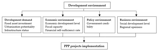 Due to the different social and economic environments in various provinces and cities, the adoption of PPP across regions is also different, showing significant heterogeneity. Many studies have suggested that the adoption of the PPP approach is greatly affected by the local social, economic, and institutional contexts [58,59]. It can then be assumed that the spatial characteristics of PPP projects across regions are closely related to these development environment factors, which comprehensively reflect whether and to what extent a region is suitable for the investment, construction, and operation of infrastructure and public services in the PPP mode [60]. From the economic growth theory and the findings of previous studies, these development environment factors can be divided into four categories: development demand, economic environment, policy environment, and business environment. We thus built the analytical framework of this study, shown in Figure 1.