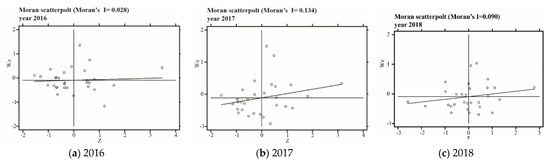 Figure 2 displays the Moran scatterplots of the PPP rates during the period from 2016 to 2018. A positive association was found between observations z of the PPP project implementation rate on the horizontal axis and observations wz of the spatially lagged factors indicated on the vertical axis, suggesting that the scalar parameter in Equation (3) is greater than zero. The linear slope equals the global Moran’s I. As shown in Figure 2, in Quadrant I (HH), the areas had a high PPP project implementation rate, and the neighboring areas had a high PPP project implementation rate, so this quadrant is defined as the HH quadrant. In Quadrant II (LH), the areas had low PPP project implementation rates, but they were surrounded by those areas with high PPP project implementation rates. In Quadrant III (LL), the PPP project implementation rates in the areas and their surrounding areas were relatively low. In Quadrant IV (HL), the areas had a high PPP project implementation rate, but the neighboring areas had a low one. Another way to perceive the strength of the positive association is to determine whether there are any points in Quadrants II and IV.