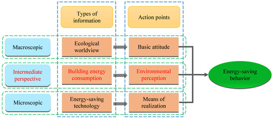 Although the content of information intervention and disclosure have become research hot spots, most of the research focuses either on the ecological worldview, which is macroscopic [14], or on the energy-saving technologies or skills, which is microscopic. The attention to intermediate perspective, that is, the energy and environment information, is not enough. The ecological worldview is the result of relevant research summarized by scholars, it includes environmental concern [14], understanding of climate change, and environmental issues [7]. Ecological worldview is regarded as the basis for the formation of generalized pro-environmental behavior [15], and has been proven to have a positive impact on energy-saving intention. However, the ecological worldview is not the only factor affecting energy-saving intention. At the micro level, the information of energy-saving technologies or skills can affect the energy-saving intention through skill and behavior choices. For example, information on personal energy-saving skills usually has a positive impact on energy-saving intention, including information on household energy-saving skills [16] and information on specific measures to reduce carbon dioxide emissions [17]. However, information related to the progress of energy-saving technology, including energy-saving products [18] and the stand-by energy consumption of electrical appliances [19], may have negative impacts on energy-saving intention due to the rebound effect (that is, although energy efficiency is improved, energy consumption may not be reduced) [20]. Existing studies show that the ecological worldview affects the basic attitude of all pro-environmental behaviors at the macro level, and energy-saving technology mainly affects the means to achieve energy saving at the micro level, thus affecting the energy-saving intention. In contrast, building energy consumption information acts on environmental perception. The relationship of the three types of information is shown in Figure 1. The impact and significance of environmental perception on energy-saving can be supported by social cognitive theory (SCT).