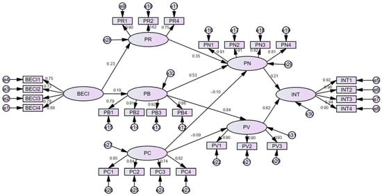 At present, relevant studies suggest that PN are influenced by attitude, consequence, responsibility [41,42], environmental concern, and perceived consumer effect [27]. As mentioned earlier, we assume that BECI will affect INT and that the attitude can be divided into three aspects: PB, PC, and PR. Among the three aspects, PB and PR can reflect the consequences, while PC reflects the ascription of responsibility. Therefore, we assume that PB, PC, and PR will have an impact on PN, as follows: