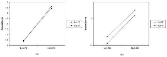 First, there is no significant interaction between PV and PN. The result indicates that the connotation of PV and that of attitude are not consistent, and PV and PN do not affect each other. Therefore, when formulating relevant policies, how to improve PV and PN need to be separately considered. Second, as shown in Figure 4a, when acting on PN, the slope of the function image corresponding to high PC is smaller than that of low PC, indicating that PC will weaken the positive impact of PB. Third, although the slope of high PR is slightly smaller than that of low PR, the two lines still do not intersect at the high PB level. These results show that, although the influence of PB decreases slightly at the high PR level, the total effect of PB on PN is still stronger than that of the low PR level.