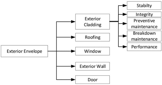 An integrated risk-informed safety–maintenance framework was developed within the scope of the research. The framework is composed of the performance model (monitoring the adequacy of the building to its designated performance), maintenance model (monitoring preventive and breakdown maintenance) through the MI and safety model (monitoring and control of the safety of the building’s systems) through the BRI. The framework is implemented using three phases: safety monitoring and control using the BRI, building performance monitoring and building maintenance monitoring using the MI. Synthesis between the safety, maintenance and performance indicators yields control loop remarks and outputs for the implementation of corrective safety maintenance activities and corrective condition-based maintenance that stimulates the synergy between safety and maintenance performance over the life cycle of the building (Figure 1). The framework is implemented with a structured object class demonstrated in Figure 2; it is composed of structural stability, structural integrity, preventive maintenance, breakdown maintenance and a performance evaluation of the components (Figure 3, referring to the exterior envelope). Similar schemes are implemented for the interior finishing; electrical system; water and sewage system; HVAC (Heating, Ventilation and Air Conditioning); fire extinguishing; elevators; Information and Communication Systems (ICT) and peripheral infrastructures.