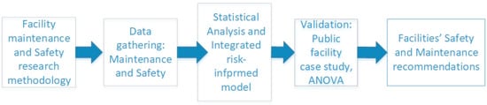The research employed analytical–empirical methods aimed at the development of an integrated maintenance–safety framework and validation of the framework through inferential statistics and a case study. The research followed the definitions of ISO/DIS 45001 [45] and the guidelines of ISO 14001 and OSH 2001: Guidelines on Occupational Safety and Health Management Systems. The research phases and method are described in Figure 3. It followed five steps [19,46,47]: (1) data gathering methodology for safety and maintenance assessment and control in educational and public facilities, (2) field survey of maintenance and safety in educational facilities, (3) inferential statistical analysis and the development of an integrated risk-informed safety–maintenance framework, (4) implementation and validation of the framework in a public facility case study and assessment of the research hypothesis using regression analysis and F-statistics and (5) conclusion and recommendations for further research. The framework is a theoretical and practical framework, and the theory is validated in a field survey in Section 3 and implemented for practical validation in Section 4.