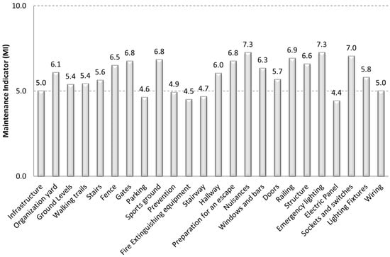 The following systems found with the highest maintenance score (i.e., most deteriorated): (1) emergency lighting (7.3); (2) static and dynamic nuisances (7.3); (3) electric sockets and switches (7.0); (4) railings (6.9) and (5) gates, preparation for escape and sports grounds (6.8) (Figure 7). The findings demonstrate that electric components, static and dynamic nuisances are the most deteriorated components. Considering MI < 5 as a threshold of high maintenance, it is evident that most of the systems do not meet this performance criterion.