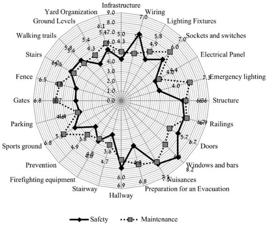 - It was found that maintenance activities strongly affect the safety of electric system components (electric panels, lighting, end-fixtures and switches); infrastructures (parking lots, sports facilities, walking trails, and yard organization), fire protection and structural components (stairways, walls, roofs and columns). This conclusion deduced from the partial Pearson coefficients of the facilities’ systems between the safety and the maintenance performance for these systems;