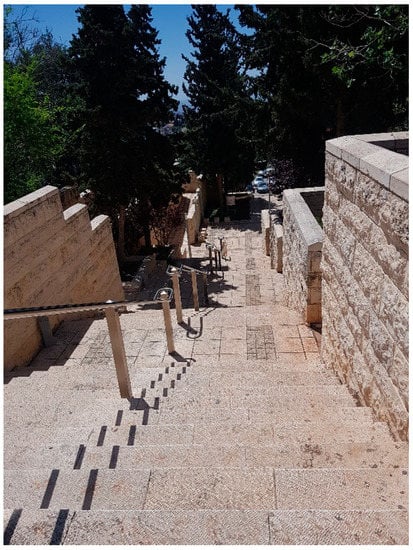 The highest mean scores of safety risk indicators for the different sections found to be: windows and bars (8.2), static and dynamic nuisances (7.5), wirings (7.0), hallways (6.9), doors and railings (6.7) (Figure 4). Figure 5 and Figure 6 demonstrate examples of typical safety hazards in sports ground and exterior cladding, respectively: lack of safety fixtures and poor maintenance of sport ground (Figure 5a,b, respectively) and deteriorated and poorly maintained exterior stone (Figure 6a,b, respectively).