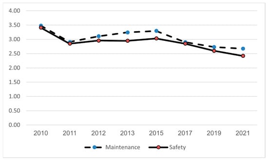 The building went under an integrated maintenance–safety performance model according to the framework put forward in this research. The maintenance and safety indicators of the building along the case study implementation period are presented in Figure 13. A high level of fitness between the safety and maintenance performance indicators is observed. Furthermore, consistent improvement in maintenance and safety is observed along the period of implementation. The maintenance and the safety performance of the building as of 2021 (22 years after construction) is remarkably high (2.673 and 2.43 for the maintenance and safety indicators, respectively), The latter indicates a safe working environment, effective safety climate and high-performance building environment.