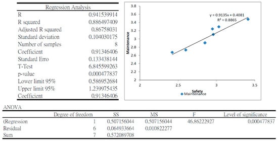 Analysis of variance of the correlation between the maintenance and safety indicators in the case study found a correlation (R2) of 0.8865 and the p-Value < 0.000478 for significance level of 0.05 (Figure 14). The regression analysis equation is: Y = 0.9135·X + 0.4081 (where Y is the maintenance indicator and X is the safety indicator). The case study strongly validates the safety–maintenance synergy hypothesis resulting from the integrated safety and maintenance performance model proposed in this research. 88.65% of the variance in maintenance performance was explained by the variance in the safety of the facility. The case study demonstrates a strong synergy between the implementation of safety and maintenance models, and that this synergy enhances simultaneous and continuous improvement of the safety, maintenance and performance of buildings. The findings were found to be significant at high level of significance (p Value = 0.00047). These findings support the practical implication of the framework for facility managers.