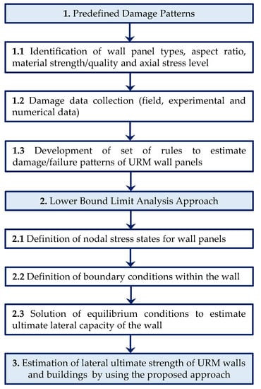 In this study, a two-phase simplified approach is proposed to predict the in-plane strength capacity of URM walls and also buildings (Figure 1). In the first phase, in-plane damage and failure patterns of URM walls are determined from available observational (field) data, experimental data and also from numerical analysis data. Then, a set of rules are proposed to estimate damage and failure patterns of URM wall panels. In the second phase, this valuable information is employed to develop a simplified numerical model with a coarse mesh for the masonry wall, which is consistent with the crack formation at the ultimate state. Then, lower-bound limit analysis approach is used to predict the failure load of the wall without any further sophisticated analysis. At the final stage, the proposed approach is verified by comparing the numerical results with experimental data from URM wall tests. By the assistance of this approach, it becomes possible to estimate the lateral capacities of ordinary, non-engineered URM walls and buildings from damage patterns at failure stage. As an ultimate goal, this structural information can be used for seismic risk assessment of regions where the building typology considered in this study governs the building stock. In this paper, wall damage is assumed to occur within the plane of the wall due to cracking, which is a function of the in-plane behavior modes explained in Section 2.