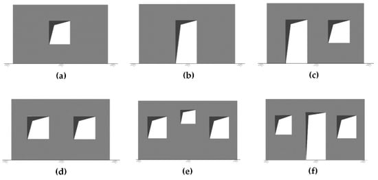 Classification of URM walls according to type and number of openings: (a) Type 1, (b) Type 2, (c) Type 3, (d) Type 4, (e) Type 5, (f) Type 6.