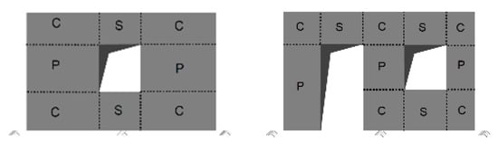 In order to distinguish the damage patterns in URM walls with openings in a more systematic manner, the walls are divided into panels according to their locations as pier (P), spandrel (S) and corner (C). The panel definitions are illustrated for Type 1 and Type 3 walls in Figure 3. In this way, it becomes possible to obtain the aspect ratio (λ) or, in other words, the height-to-length ratio of the panels, which is known to have a significant effect on the in-plane behavior of piers and spandrels. In this study, the panels are classified as squat (λ < 1.0), regular (1.0 < λ < 2.0) and slender (λ > 2.0) in terms of their aspect ratios.