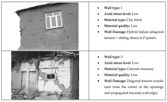 The first set of data is collected from field observations of seismic damage on perforated URM walls. Most of this classified information was obtained through a vast number of photos and notes taken during the post-earthquake site investigations of the authors after major earthquakes in Turkey, including the 1995 Dinar [], 1999 Kocaeli and Duzce [], 2010 Elazig Karakocan [,] and 2011 Van Ercis [] earthquakes. The remaining data were taken from the technical reports and papers, which include detailed information regarding URM damage after major earthquakes in different parts of the world [,,,,,,,,]. An example set of collected data is presented in Figure 5. The complete data set for observed URM wall damage can be obtained from Ref [].