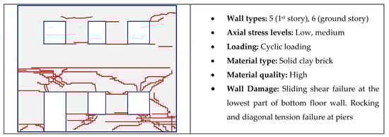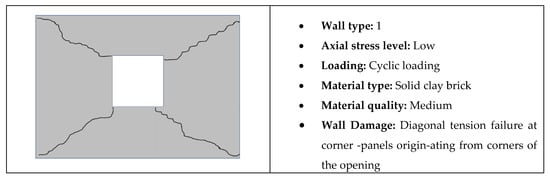 The second set of data is collected from experimental tests of URM wall and building specimens by examining numerous related papers and reports from the literature [,,,,,,,,,,,]. Just like in the case of observed damage, the collected data include wall aspect ratio, material type, axial load level and the corresponding damage/crack pattern. An additional parameter is the loading protocol (i.e., quasi-static, pseudo-dynamic or real-time dynamic test). Ultimate damage states for an example set of experimental data are illustrated in Figure 6. The complete data set for experimental URM wall damage can be obtained from Ref [].