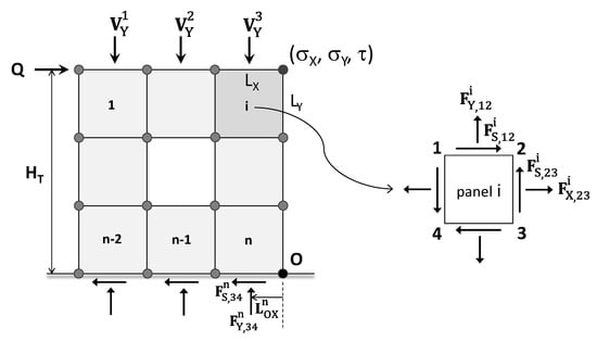 In the first stage of limit analysis, the masonry wall under concern is divided into macro-panels, as shown in Figure 3. The corners of each rectangular panel are assumed to carry three in-plane stress components (two normal, one shear), which is consistent with the state of stress of that panel, as illustrated in Figure 8. In the figure, Q denotes the unknown ultimate lateral force, and stands for the known vertical load acting on the uppermost layer of panels, respectively. The nodal stresses are the unknowns in this lower-bound limit analysis problem, and they should be obtained through equilibrium conditions, as explained in the next sub-section.