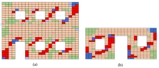 Figure 9b presents the state of stress for wall type 6 from the wall specimen from Ref []. The considered masonry wall in this study is a single-story wall panel with one door and two window openings. Just like the previous case, all geometrical dimensions, material properties and loading conditions are taken from the reference. According to Figure 9b, the cells with stress values that exceed the failure criterion are mostly located at cross corners of window openings and bottom-left corners of the piers.