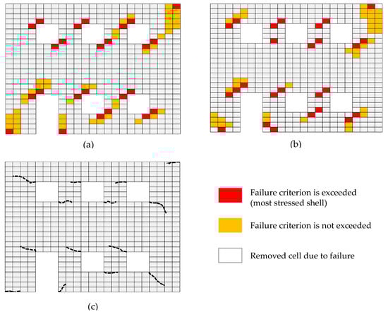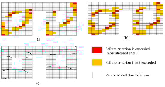In the second stage of numerical analysis, the crack propagation is simulated by using an iterative procedure that includes cell removal from the mesh. Since stress distribution in the wall can be changed after the failure of the first shell element, the most overstressed adjacent cells are the next candidates for reaching the failure state. Hence, the cells at failure are removed from the mesh, and then, the adjacent cells are examined for whether they have reached their failure limits or not. In this way, it becomes possible to simulate the propagation of failure within the wall. The results of second stage numerical analysis are also provided in Section 3.1.