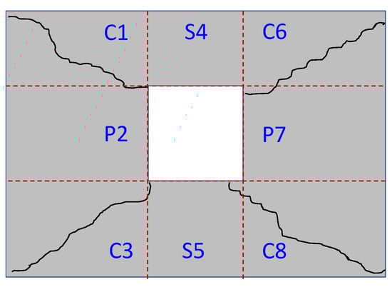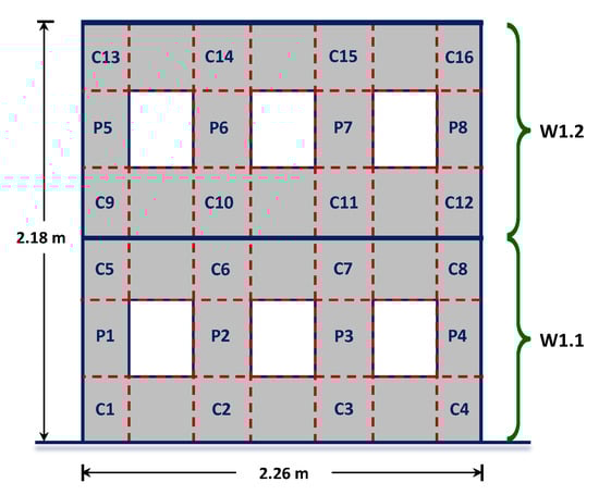 The first wall specimen considered for verification belongs to Ref []. The considered wall specimen has dimensions of 194 × 143 cm with 16 cm thickness and a window opening at its center, which has a dimension of 52 × 47 cm. As a URM wall, the compressive masonry wall strength fm = 11.7 MPa is reported, while the tensile strength of the material is taken as 5% of the compressive strength, which is fmt = 0.56 MPa. Under a vertical load of 41.2 kN, the maximum horizontal load was measured as 26.1 kN. The discretization of the damaged wall specimen under consideration is given in Figure 14.
