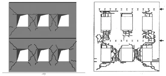Similarly, Figure 11 stands for the crack initialization and propagation of wall type 6 that was taken from the experimental study conducted by Ref []. It can be observed that the crack patterns and corresponding failure modes in Figure 11 are very similar to the ones presented in Figure 10. Again, two different failure modes govern the wall behavior: diagonal tension and sliding shear. Moreover, the crack propagation, which starts from the corner of the openings, is not different from the previous findings. The damage distribution obtained from the numerical analysis has a satisfactory match when compared to the experimental behavior of the wall [].