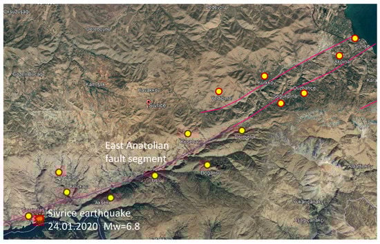 Remote villages with tens of non-engineered URM buildings in eastern Anatolia, Turkey. The line shown on the map is a seismically active segment of the East Anatolian Fault (EAF), on which the latest major earthquake occurred in January 2020 with Mw = 6.8, as shown in the figure. This earthquake caused severe damage in most of the remote villages, and it was very difficult to access them due to harsh climatic conditions in the mountainous regions.