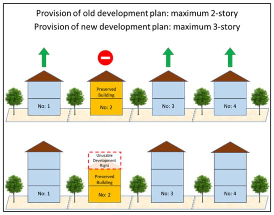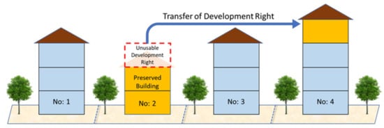 Buildings that have cultural and historical significance are very essential elements of our living spaces. Among many other benefits, they add value to urban development with aesthetics, and they also connect us to our past and provide us with a sense of communal or national continuity [,]. However, these valuable buildings are usually under the threat of demolition to be redeveloped to a higher density for an economic return, i.e., for development gain. This is not a surprise in the development business where profits can be extremely high. Therefore, cultural heritage must be protected by public authorities for the sake of public interest, instead of abandoning them to their fate (Figure 1).
