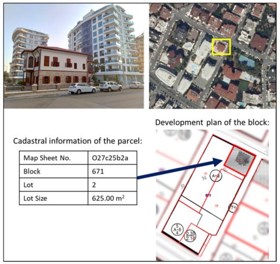 The historic building is located in the parcel No. 671/2 (meaning Lot 2 of Block 671) with the size of 625.00 m2 in the northeastern part of the block (Figure 3). The building is listed as “cultural heritage” by the Preservation Board and the preservation decision was applied on the development plan by marking the lot with parallel lines. With this decision, the building cannot be demolished, and the lot cannot be redeveloped.