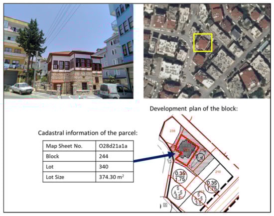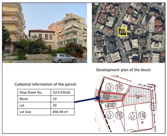 Example of a historic private residence in Alanya. Top left: A side-view of the building (June 2019); top right: A satellite image of the neighborhood; bottom right: development plan of the block; bottom left: cadastral information of the parcel. (For further information, please see Data Availability Statement section).