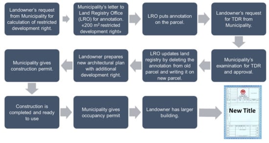 However, there is a third option. It has been practiced in various countries, stood the test of time and can be a good option for Turkey as well: transfer of development rights (TDR, or in Turkish imar hakkı transferi or imar hakkı aktarımı). It is widely accepted that the TDR method has never been used in Turkey, or at least a recorded transfer case could not be found so far [,,,,]. Therefore, this paper attempts to offer a step-by-step implementation procedure for TDR in Turkey in compliance with the legal, organizational, professional, and traditional specifications of the country.