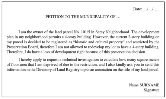 Petition from the landowner to the municipality for the recognition and registration of the unusable development right on land registry.