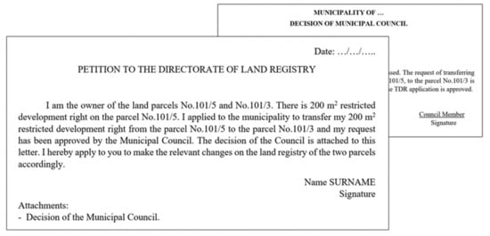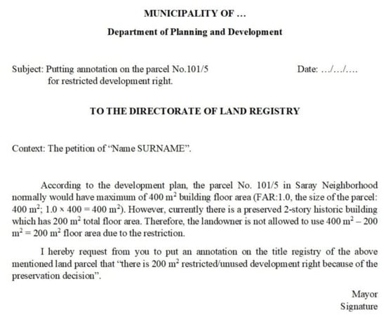 The municipality receives the petition, and the relevant department investigates the request and calculates the exact square meter of the restricted development right of the petitioner. After finding the number, this information is sent by the municipality to the local land registry office to put the annotation on the title accordingly (Figure 9).