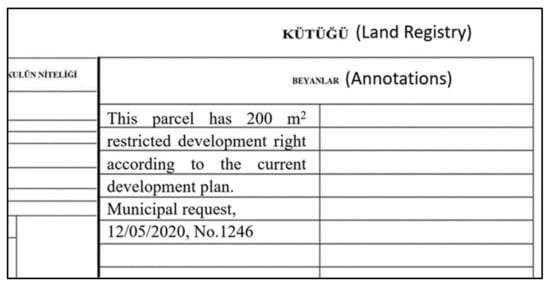 When the official letter from the municipality arrives to the local land registry office, the registry personnel put the annotation on the title of the property in the land registry book. Even though today annotations are only recorded electronically on the Land Registry and Cadaster Information System (TAKBIS) since 2015 in Turkey [,], for a better read and simplicity, the classic book registry method is showed in the figures in this paper (Figure 10).