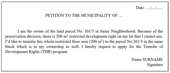 The transfer of development right is now “legally” made; however, it is not made “practically” yet. After this point, the owner will apply to the municipality to take a development sketch (in Turkish, imar çapı) for the receiving parcel together with its bonus density. In our scenario, the original right of the receiving parcel was 400 m2, plus the incoming TDR of 200 m2, the total floor area is now 600 m2. The municipality will give a development sketch for 600 m2 floor area. Then, the landowner will apply to an architect to prepare a building project which has 600 m2 total floor area with an appropriate building height and width as implied by the municipality. After that, the landowner, together with the new architectural plan and other relevant documents, will apply to the municipality for a construction permit (in Turkish, inşaat ruhsatı). After the construction is completed and ready to use, the municipality will give the occupancy permit (in Turkish, yapı kullanma izin belgesi) [,]. At the end, the landowner will have a larger building and the restricted development right is completely consumed by the owner. As a result, the State did not need to spend any money and the injustice problem is solved by using the restricted development right of 200 m2 on another land parcel (an overview of the procedures can be found in Figure 7).