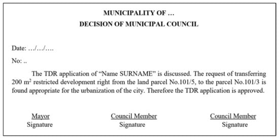 When the petition of TDR request arrives to the municipality, it will be analyzed if it is appropriate for the urbanization rules and principles. If the municipality finds no obstacles, the request will be approved. If it is found inappropriate for the urbanization of the city, the request will be declined. The decision-making body in the municipality in Turkey can be municipal board (in Turkish, belediye encümeni) or municipal council (belediye meclisi). However municipal council is preferred and suggested in this study. The request is firstly analyzed by the planning and development department of the municipality which mainly consists of planners, engineers and architects. After the initial research, the request and the technical opinion are sent to the municipal council for the final decision. According to our scenario, the request of TDR is approved (Figure 12).