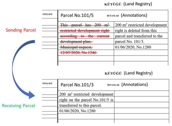 After the application of the landowner, the local land registry office will make the transfer on the land registry book by canceling/deleting the annotation on the sending parcel and putting a new annotation on the receiving parcel. The transfer is clearly referenced to each other on both titles (Figure 14).
