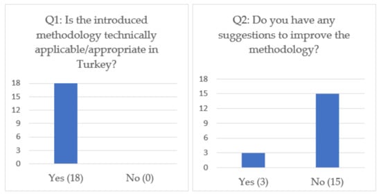The “technical interviews” were made only with the focus on the technical steps introduced above. The interviews were performed with the same manner as explained in Section 6 step-by-step. After completing the presentation and explaining the implementation steps, the interviewees were asked the following two questions: “Q1: Is the introduced methodology technically applicable/appropriate in Turkey?” and “Q2: Do you have any suggestions to improve the methodology?”. Since the introduced methodology is offered for the whole country, the answers of participants were not place-specific either. The overview of answers can be seen in Figure 15.