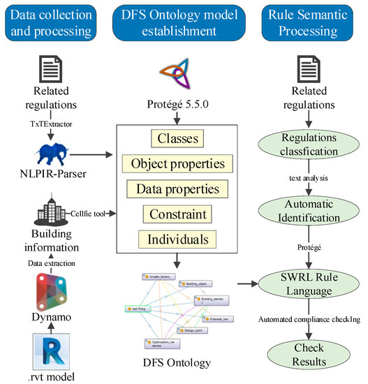 Mohamed et al. [17] proposed an ontology system integrating BIM information and semantic web technology to enrich the semantics of existing building facilities. Zhong et al. [18] proposed an ontology framework integrating BIM and environmental monitoring to implement compliance checking. Dibley et al. [19] proposed the OntoFM, an ontology framework that supports real-time building monitoring. The development of the ontology framework lays the foundation for realizing information sharing and semantic interoperability. The ontology approach is also applicable to the development of an automated compliance checking framework incorporating the DFS concept. Jiang et al. [20] proposed a grey-box checking technique and a BIM-based automated code compliance check method to ensure the accuracy of design work that utilizes multi-ontology fusion. These studies all provided information for the development of the ontology framework and its underlying ontology in this paper.