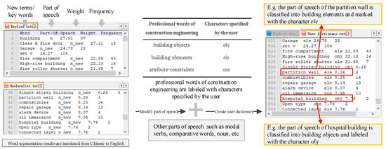 Figure 2 illustrates the process of user dictionary creation, and the results of word segmentation and part-of-speech tagging of regulatory text based on the user dictionary. Taking the chapters of building layout and fire zoning as an example, NewTermlist containing 49 new nouns and Keylist containing 497 keywords were generated in NLPIR’s new word discovery function. The part-of-speech of each word was checked, and words determined to be professional words of construction engineering were labeled with characters specified by the user. Finally, the parts of speech used to label professional words of construction engineering were summarized into three types: building objects, building elements, and attribute constraints. Other parts of speech, such as modal verbs and comparative words, can be automatically tagged to the corresponding words by NLPIR without adding them to the user dictionary.
