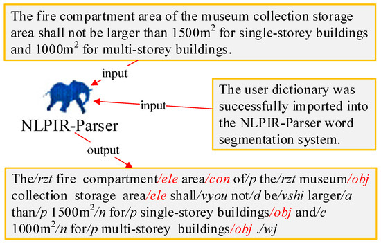 The user dictionary was imported in the word segmentation function interface of NLPIR, according to which the system processes the input regulation text. As shown in Figure 3, the rules text was segmented according to the part of speech and the professional characters specified by the user.
