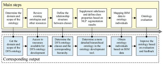 In the field of construction engineering safety, ontology theory has been researched and practiced to a certain extent, but there is still no unified standard to regulate the development of DFS ontology. Various scholars have put forward different ontology development principles according to their research. Influenced by these research efforts, the DFS ontology development method incorporating BIM technology and NLP technology is demonstrated in Figure 5.