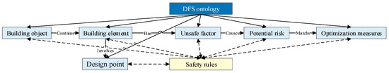 The user dictionary obtained by NLPIR processing of the text of safety regulations contains key terms for constructing the compliance inspection process from the perspective of DFS, where building objects, building elements, design points, unsafe factors, potential risk, and optimization measures are extracted to constitute the main classes of DFS ontology and the object properties or relationships among them as explained in Figure 6.