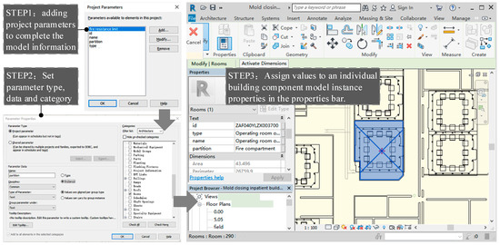 Autodesk Revit software was used for the building information modeling and model preprocessing in this section by assigning values to the properties of the created building model and using the method of adding project parameters to complete the model information. The purpose of this step was to make the building component model contain the information needed to create the DFS ontology. The new project parameter was defined as a type parameter, and the component type to which it was attached was selected in the filter as illustrated in Figure 10. For example, the model type to which the property partition belongs was the room model. The model type to which the property fire resistance limit belongs was the wall, fire door, etc. The specific values of these properties were entered in the property column of the corresponding component model.
