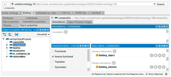 Moreover, as a mapping relationship linking domains and ranges, object properties have seven main properties that can affect the transitivity of properties, thereby affecting the inference engine to form previously unnoticed but legal connections between other classes. Therefore, in addition to the object property relationship is a connecting the subclass and the superclass, the five main object properties between the six main classes defined in this section and their domains, ranges, and characteristics are illustrated in Table 3. The Protégé wiki [38] can be consulted for a detailed explanation of property characteristics.