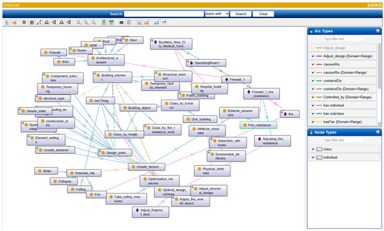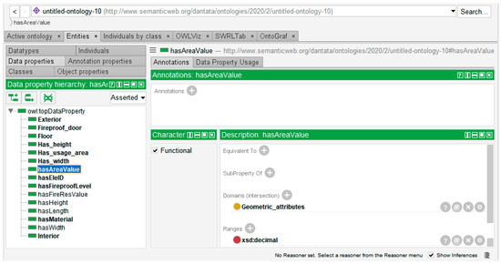 Properties in ontology include object properties and data properties. Object properties exist in the relationship between two classes and two individuals, while data properties describe the relationship between classes or individuals and values. Although the relationship between the main classes was defined in the previous steps, with the change in the range and domain of ontology properties [34], the object properties and data properties also need to be expanded to improve the connection of subclasses in the ontology. For example, the subclass room of the building element was connected to the subclass area of the unsafe factor by the object property hasArea, while it was not connected to the subclass weight of the class Unsafe_factor. The subclass Area of the class Unsafe_factor had the data property hasArea and the domain was the area value.