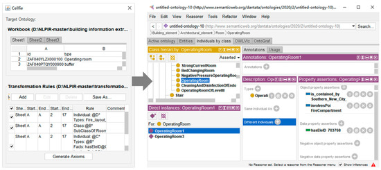 At present, no plug-ins have been developed to directly convert model data into the OWL format; therefore, data interoperability was the key to completing the inference, which required preprocessing of BIM. The model information extraction and conversion methods proposed by the current research efforts were not perfect. The information interaction based on IFC standards has problems, such as lack of logic and limited-expression range, and the business model checker was limited to specific rules checking, resulting in poor scalability and low knowledge utilization of building information. There are several ways of outputting information that can be applied to Revit in which project parameters can be extracted to Excel spreadsheets through Dynamo tools. Moreover, the Cellfie tool can directly convert tabular data into the OWL language and map it to the existing ontology to realize semi-automatic data structure conversion, which provides a feasible method for data interoperability between modeling software and ontology application software. Figure 4 provides the process of realizing data interoperability, where the solid line represents the transfer of data, and the dashed line represents the transition of the software scene.