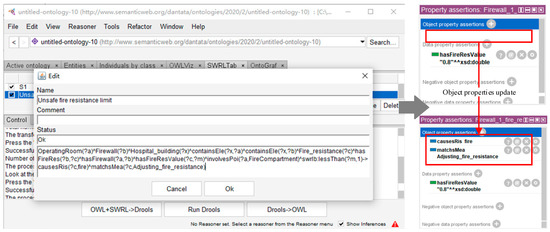The SWRL editing interface is presented in Figure 17. The Drools inference engine in Protégé is invoked, which is a rule inference engine based on description logic and supports the Java language and has good compatibility and inference functions. Run the inference on the engine interface, and the inference result is returned to the individuals of the ontology to update the DFS ontology. e.g., after rule 1 runs, the results fed back from Drools to the OWL ontology showed that two object properties were added to the Firewall_1_fire_resistance individual.